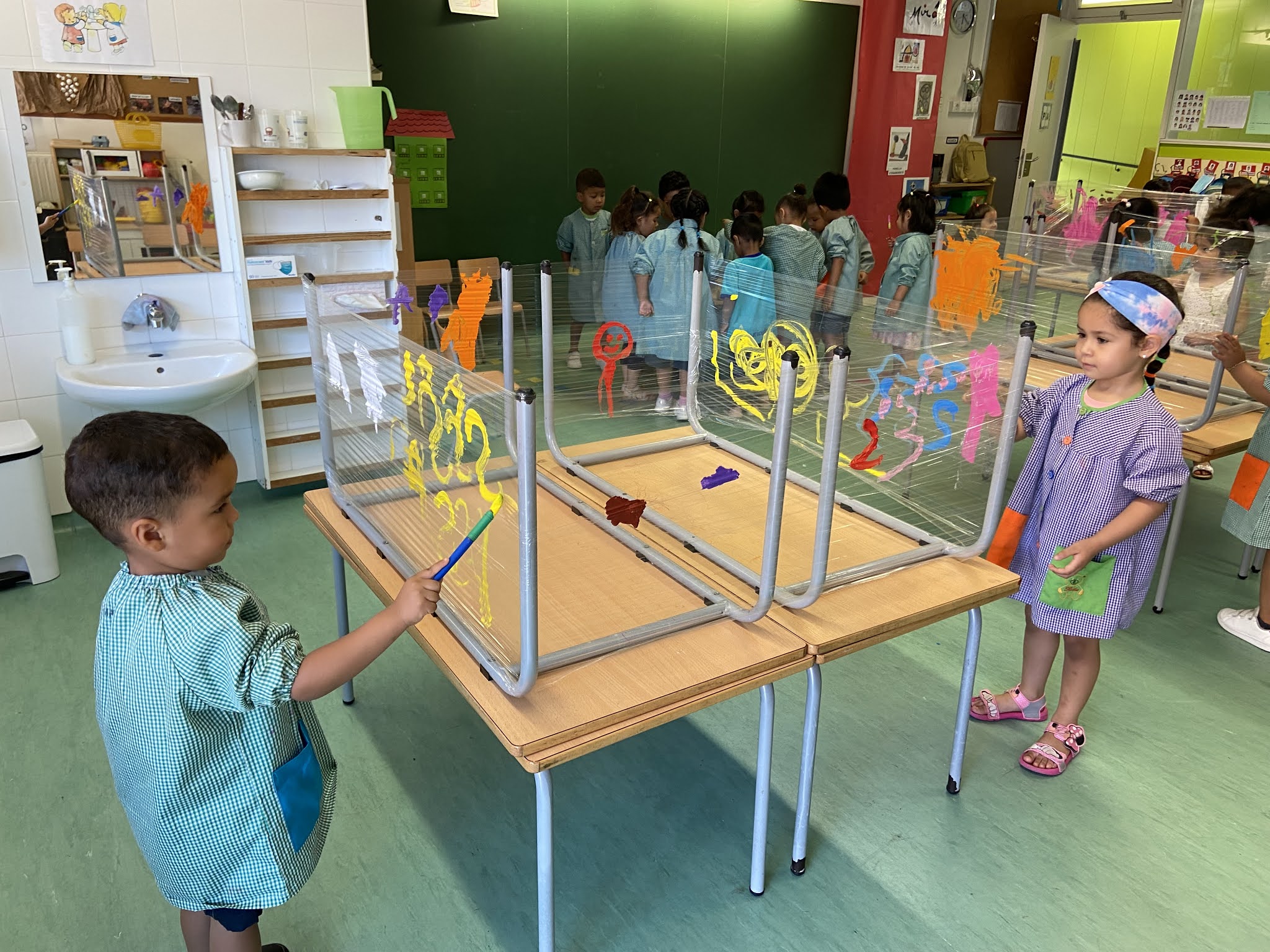 - Un altre matí ficarem la classe pates a amunt i vam pintar sobre film transparent! Va ser divertit veure'ns entre els dibuixos dels nostres companys/es!